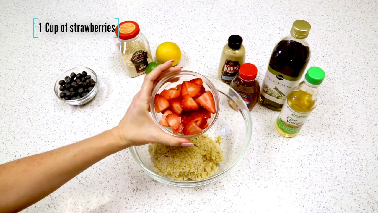 1. In a large mixing bowl, add the cooked quinoa, strawberries, and blueberries. Set aside.